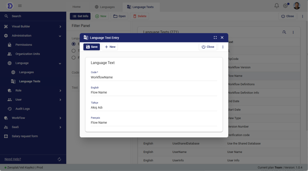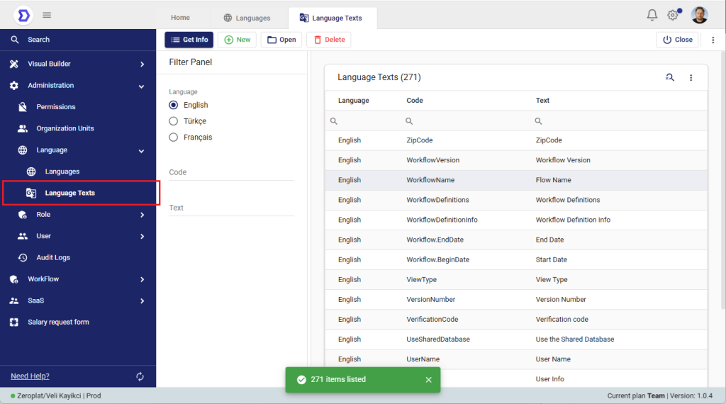 The Language Texts screen in Zeroplat is where all translatable keys (codes) and their corresponding localized texts are managed. This feature ensures that every menu, label, message, or workflow term can be translated into the languages defined for a tenant.
