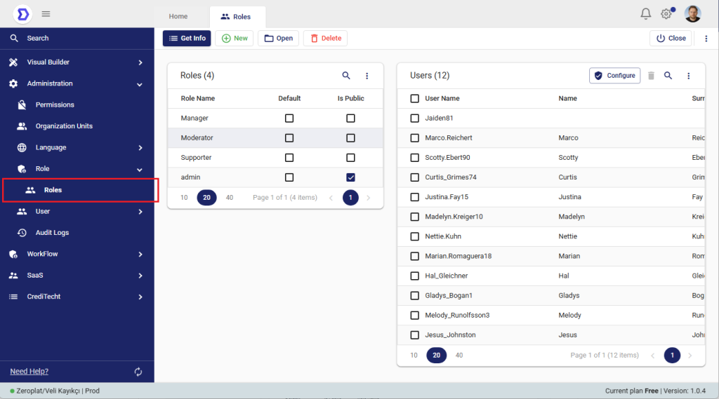 The Roles page in Zeroplat is the central area where user roles are created, managed, and assigned. Roles are essential for defining access rights and permissions across the platform. They ensure that users only see and interact with the resources, workflows, and actions that match their assigned responsibilities.