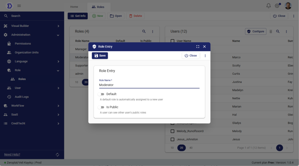 The Roles page is where administrators define and manage user roles. Each role can be marked as Default or Public, and users can be linked to roles to inherit permissions. This ensures flexible, secure, and organized access management throughout Zeroplat.