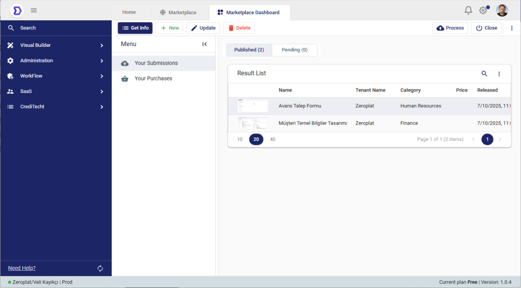 The Marketplace Submission Entry screen lets you publish your applications or modules to the Zeroplat Marketplace. Here you can upload screenshots, set a name, category, and version, decide if it’s free or paid, and provide descriptions and changelogs. Once saved, your submission appears in the Marketplace Dashboard and can be shared, downloaded, or purchased by other users.