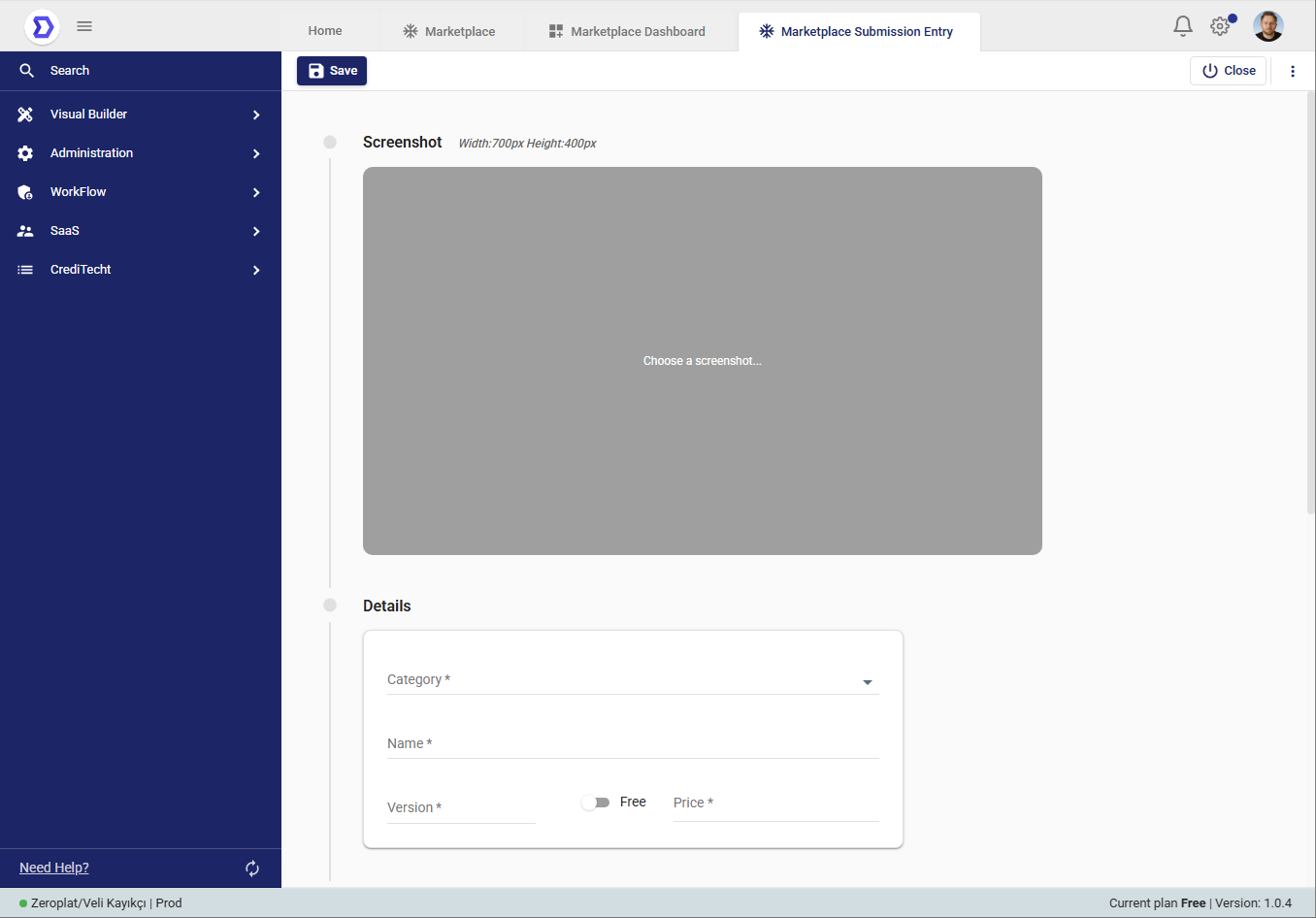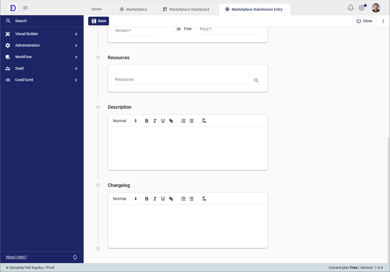 The Marketplace Submission Entry screen allows users to publish their custom-built applications, forms, or modules to the Zeroplat Marketplace. From here, creators can prepare their submissions by providing all necessary details before making them available to other users.