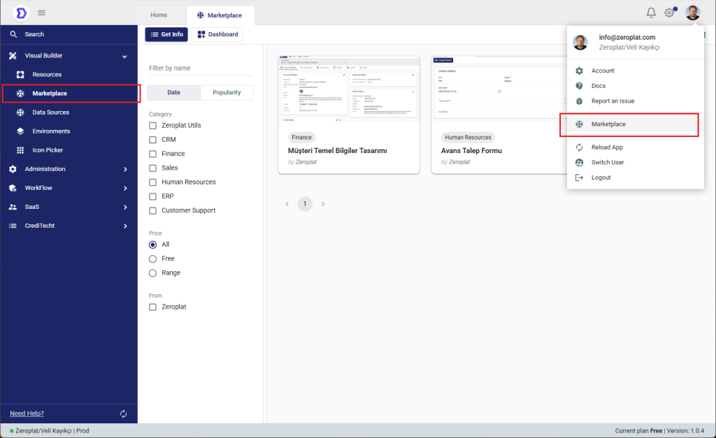 The Zeroplat Marketplace is a central hub where users can explore, share, and manage applications, modules, dashboards, and components created within the Zeroplat platform. It enables seamless collaboration by allowing users to publish their work or download ready-to-use solutions, accelerating development and extending the platform’s capabilities.