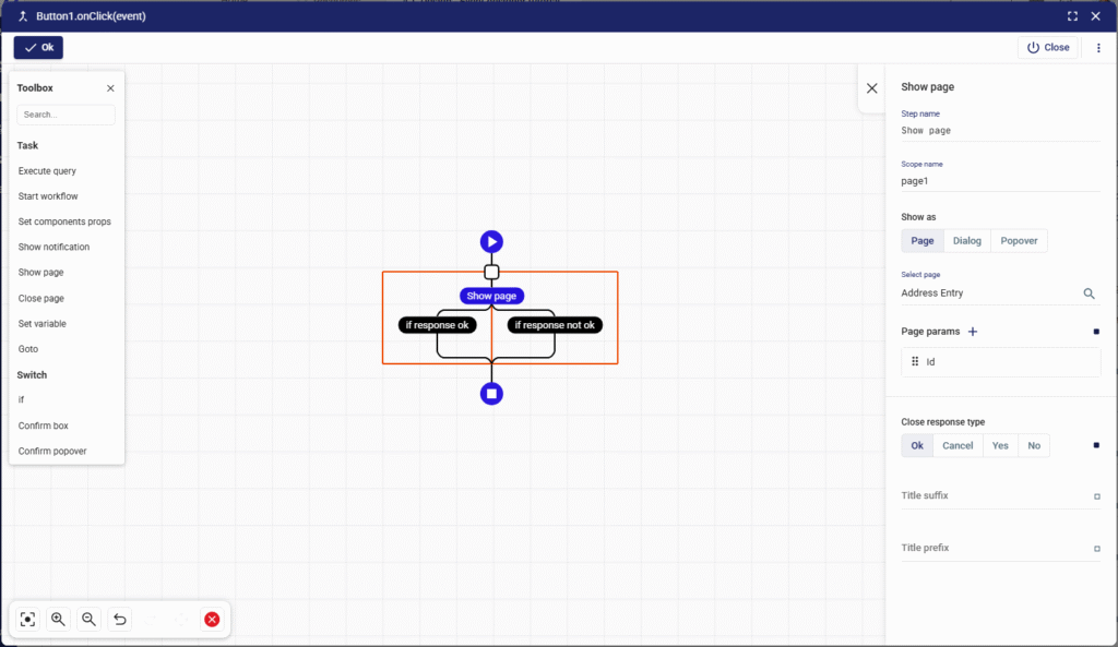 Close response type | Dialog, Popover | Defines how the task handles page closure. Options: Ok , Cancel , Yes , No . Branching can be applied (e.g., “if response ok” vs “if response not ok”). Works like Windows Forms’ DialogResult . | if response ok → run save query |