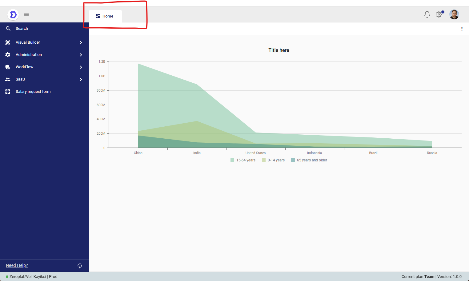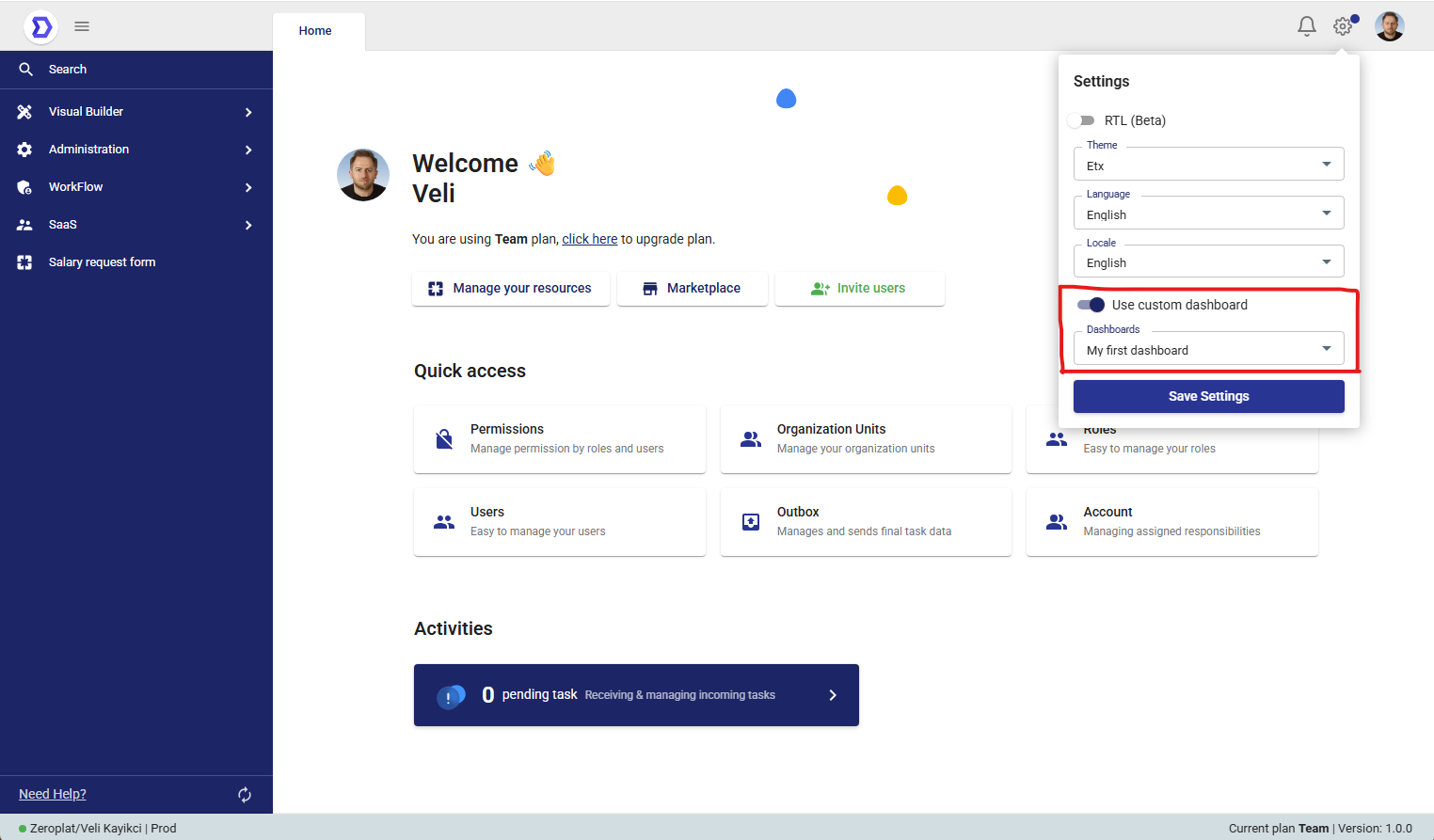 - When Use custom dashboard is enabled, the selected dashboard will replace the default home view.