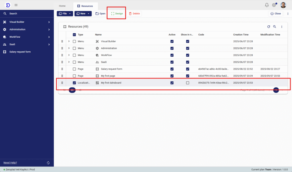 - From the resource list, select the page you want to design (e.g., My first page).