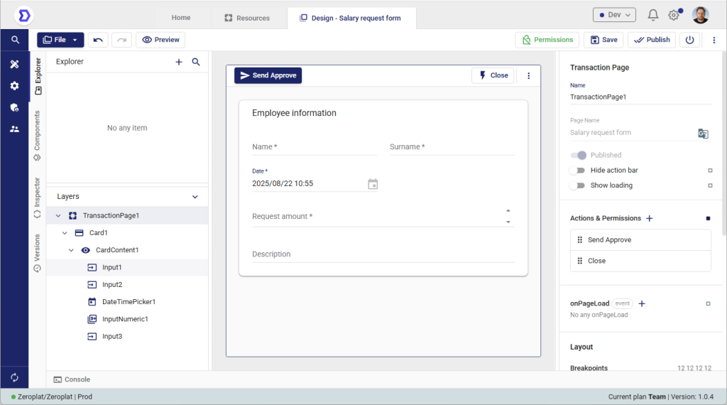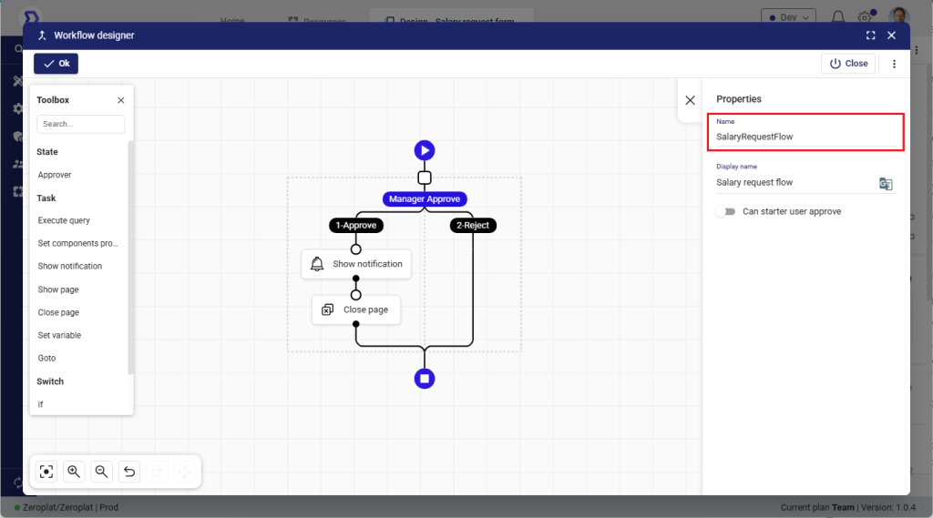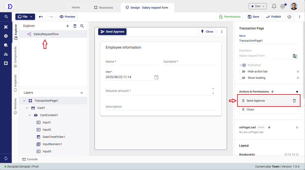 - Action Button (top bar): The “Send Approve” button triggers the workflow (SalaryRequestFlow) that we previously connected.