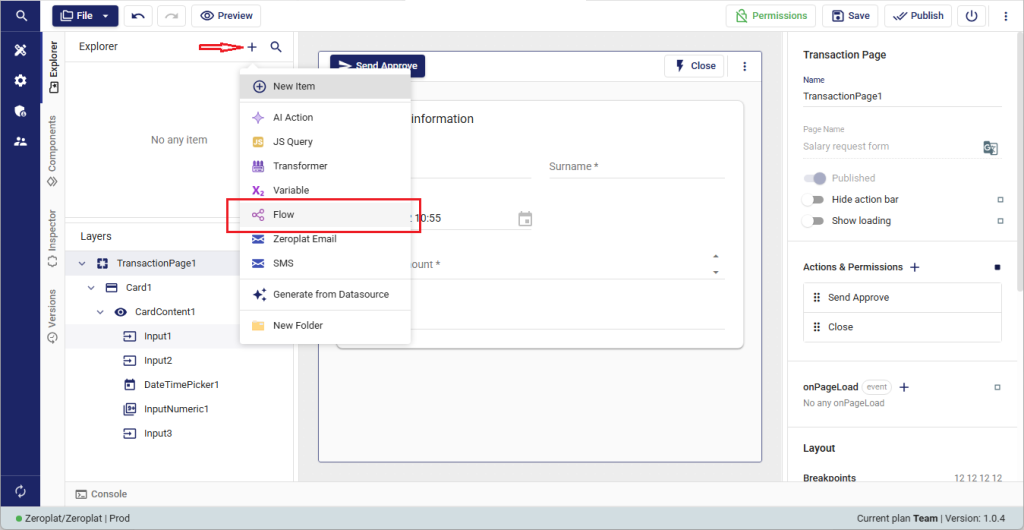 Workflows (Flows) in Zeroplat allow you to design and automate business processes directly inside your applications. This section explains how to create a new Flow from scratch.