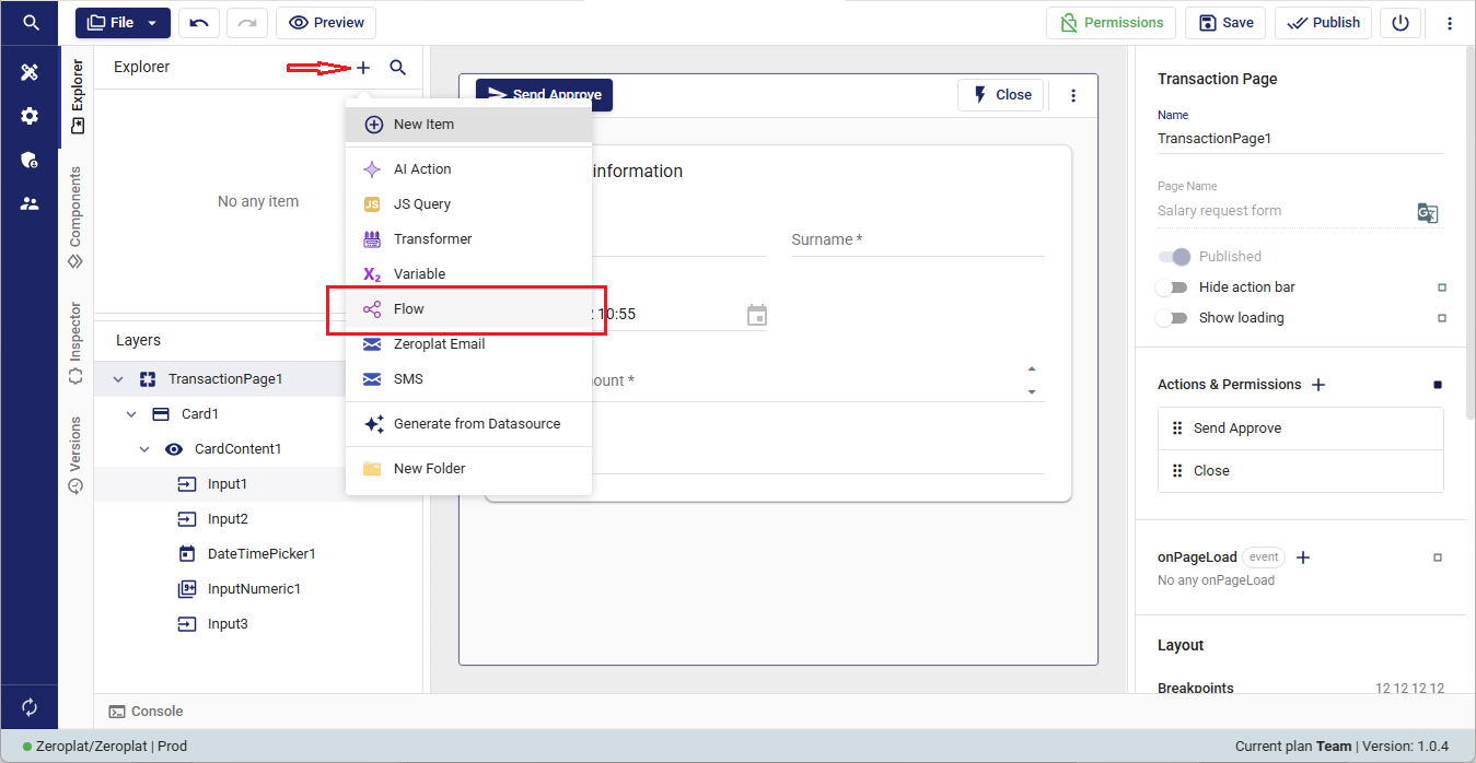 At the top of the Explorer panel, click the “+” icon to add a new item. - Select Flow
