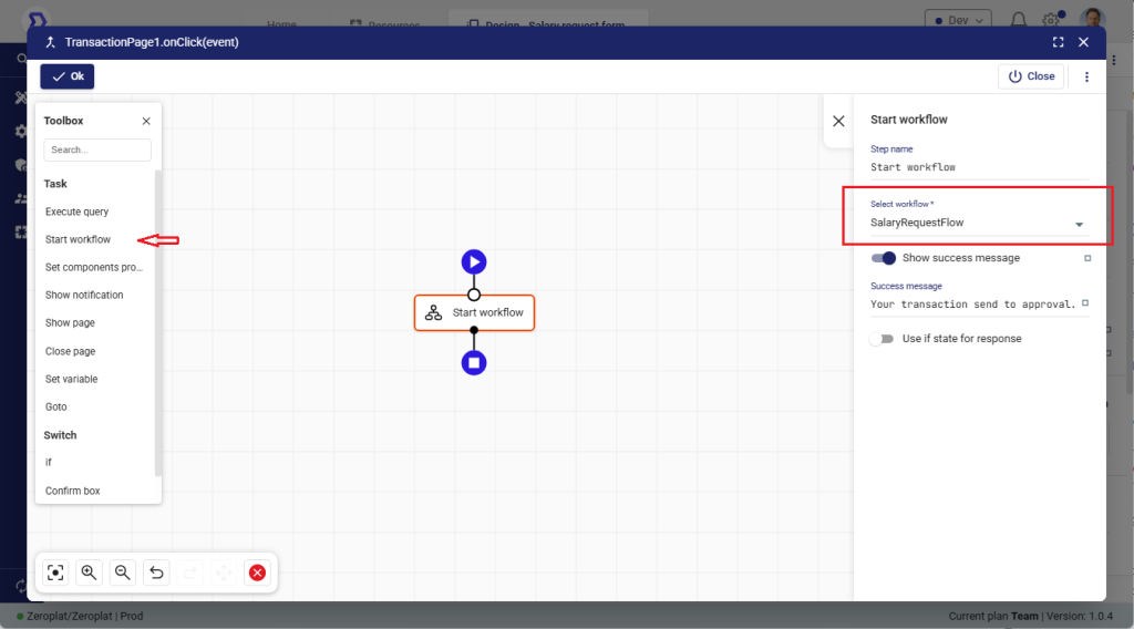 - Success message: You can define a confirmation message (e.g., “Your transaction send to approval.”) which will be displayed when the workflow starts successfully.