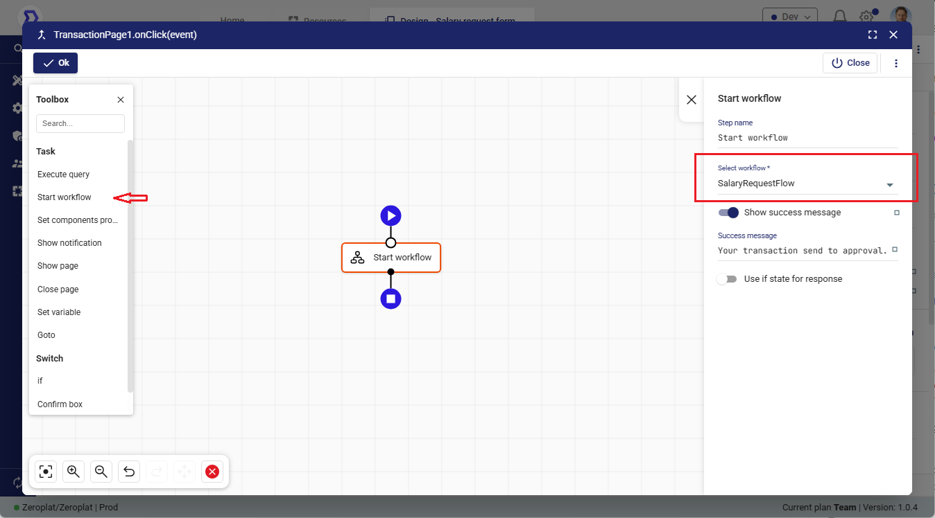 - Toolbox (left panel): From the task list, the option “Start workflow” is selected. This allows you to initiate any of your defined workflows when a certain event occurs (e.g., a button click).
