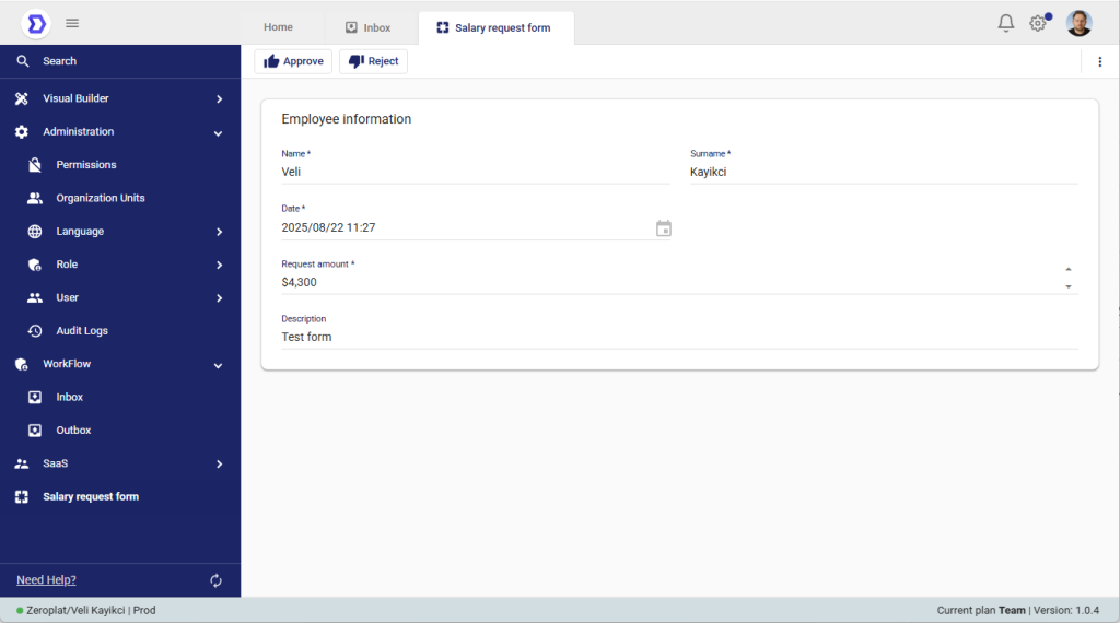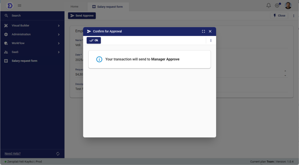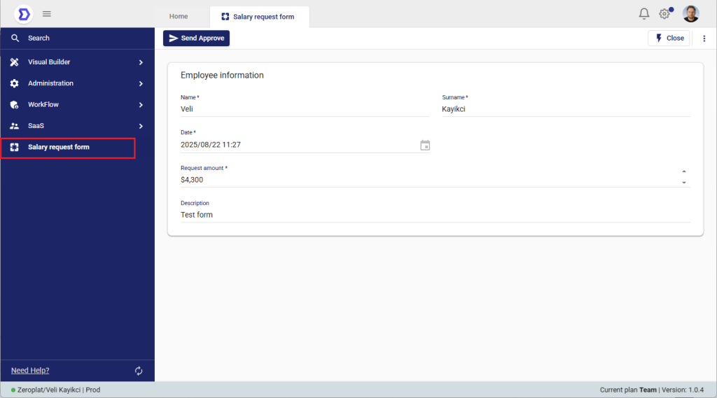 At this stage, users interact directly with the form we designed. By navigating to the left panel and selecting Salary request form, the employee can input the required details. Once the Send Approve button is clicked, the form data is passed to the workflow, automatically starting the approval process.