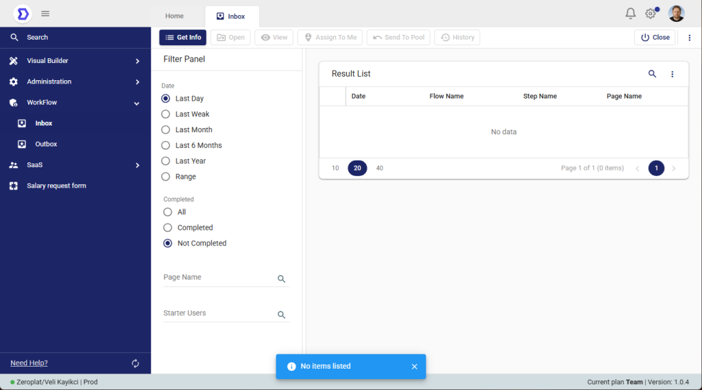 - Result List (main panel): Displays all workflow tasks assigned to the user. In this example, there are currently no pending items.