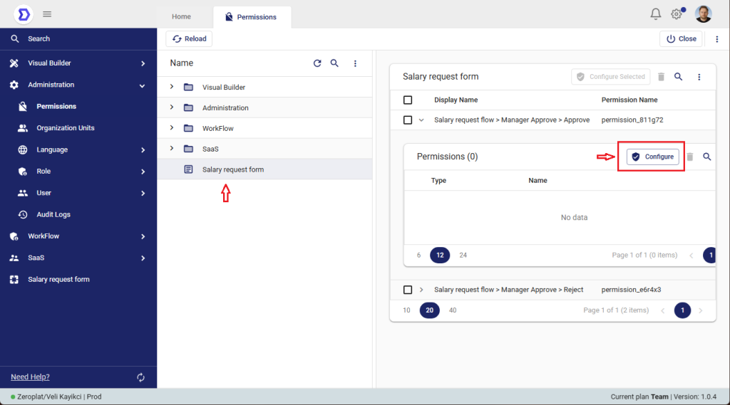 - Navigation Menu (left panel): The Permissions section is open, and under it, the Salary request form has been selected.