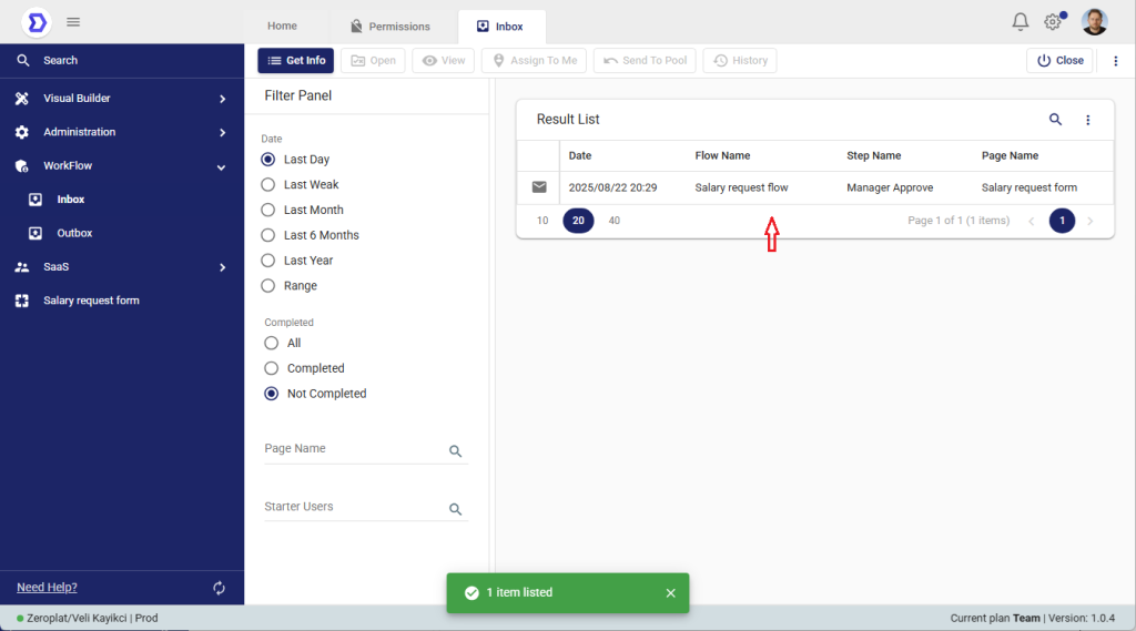 Since we previously configured the workflow permissions to allow only Admin role users to approve or reject requests, the current user (logged in with the Admin role) is able to see the pending item in the Inbox. If the user did not have the Admin role, this approval task would not appear in their Inbox.
